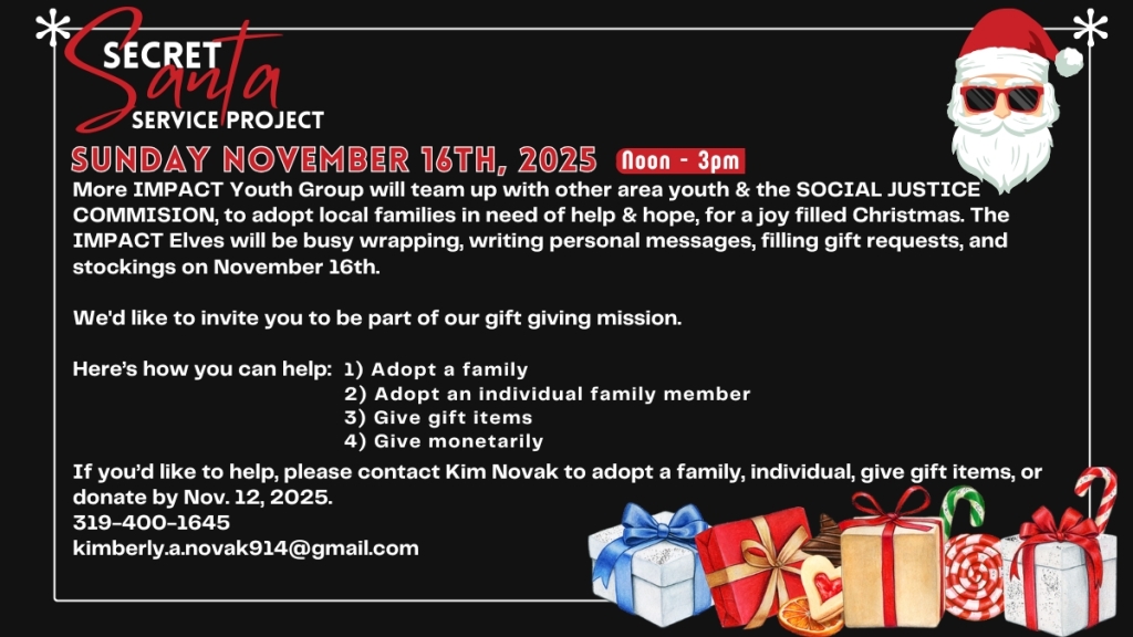 Parent & Student Meeting happen at the beginning of each year. The Parent & Student Meeting for the 2026 Confirmation Class is scheduled for August 3, 2025 @12:30pm in the lower level. Classes will begin on Sept. 7, 2025 at 12pm in the lower level. If you have any questions or would like more information, please contact Angie Goodwin at coralstmym@diodav.org or call 319-337-2173.